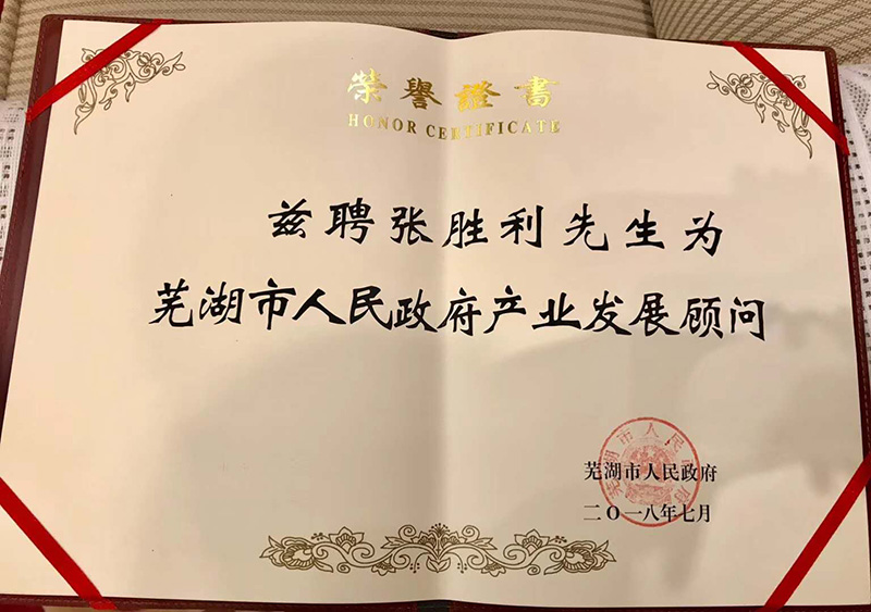 张胜利先生作为一名新加坡籍华人,热爱祖国,热爱自己的员工,热爱他的事业。他和SEW中国管理团队始终以利国利民为己任,努力为祖国的经济腾飞贡献着自己的力量。基于张先生对德国工业4.0和中国制造2025计划的深厚认知和践行;基于张先生对战略性新兴产业放眼全球的世界观、发展观,芜湖市人民政府在此次到访期间特聘张胜利先生为“芜湖市人民政府产业发展顾问”。
